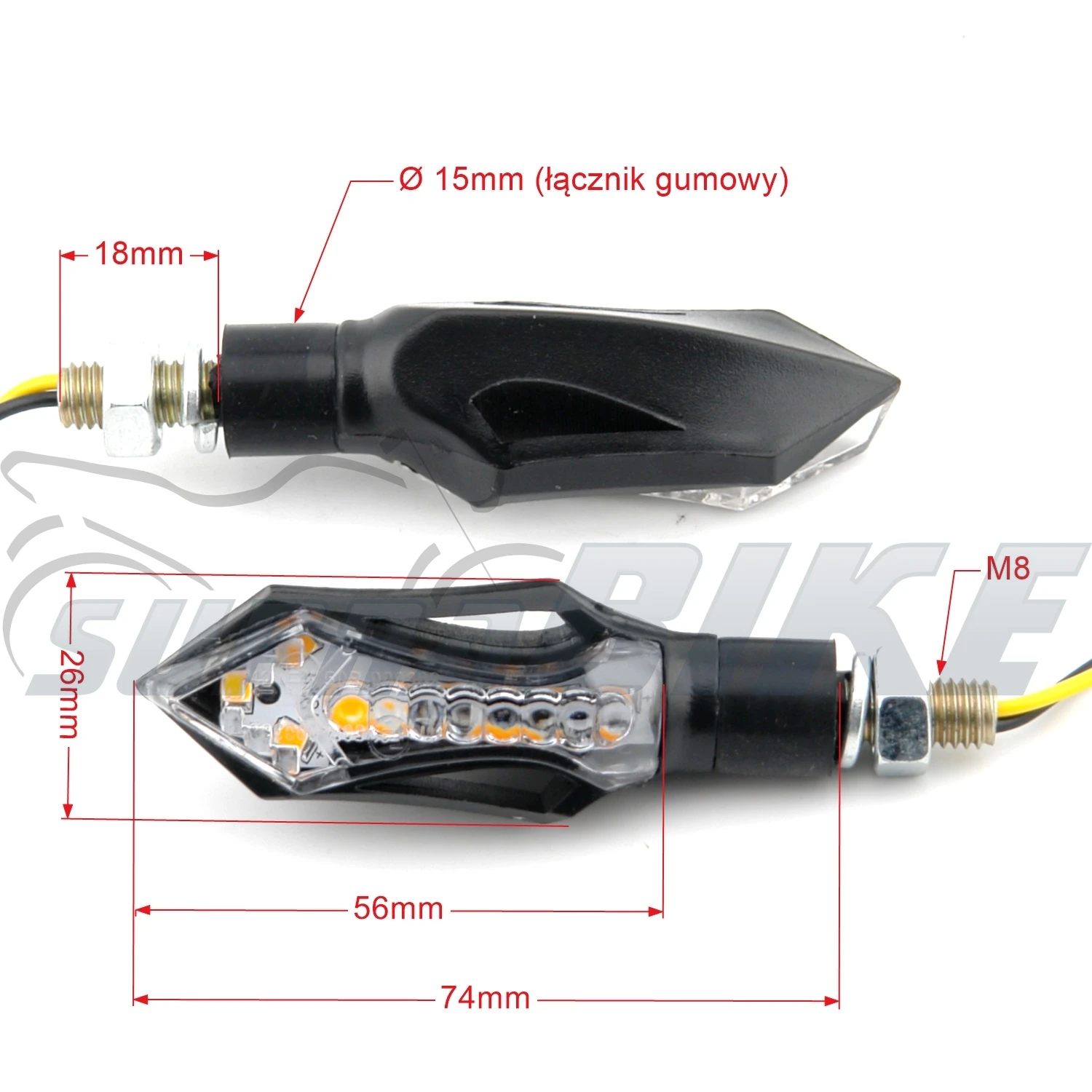 Komplet kierunkowskazów diodowych uniwersalnych do motocykli, motorowerów, skuterów, ATV, UTV.